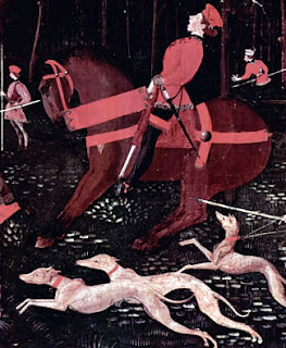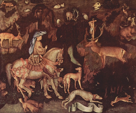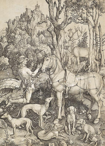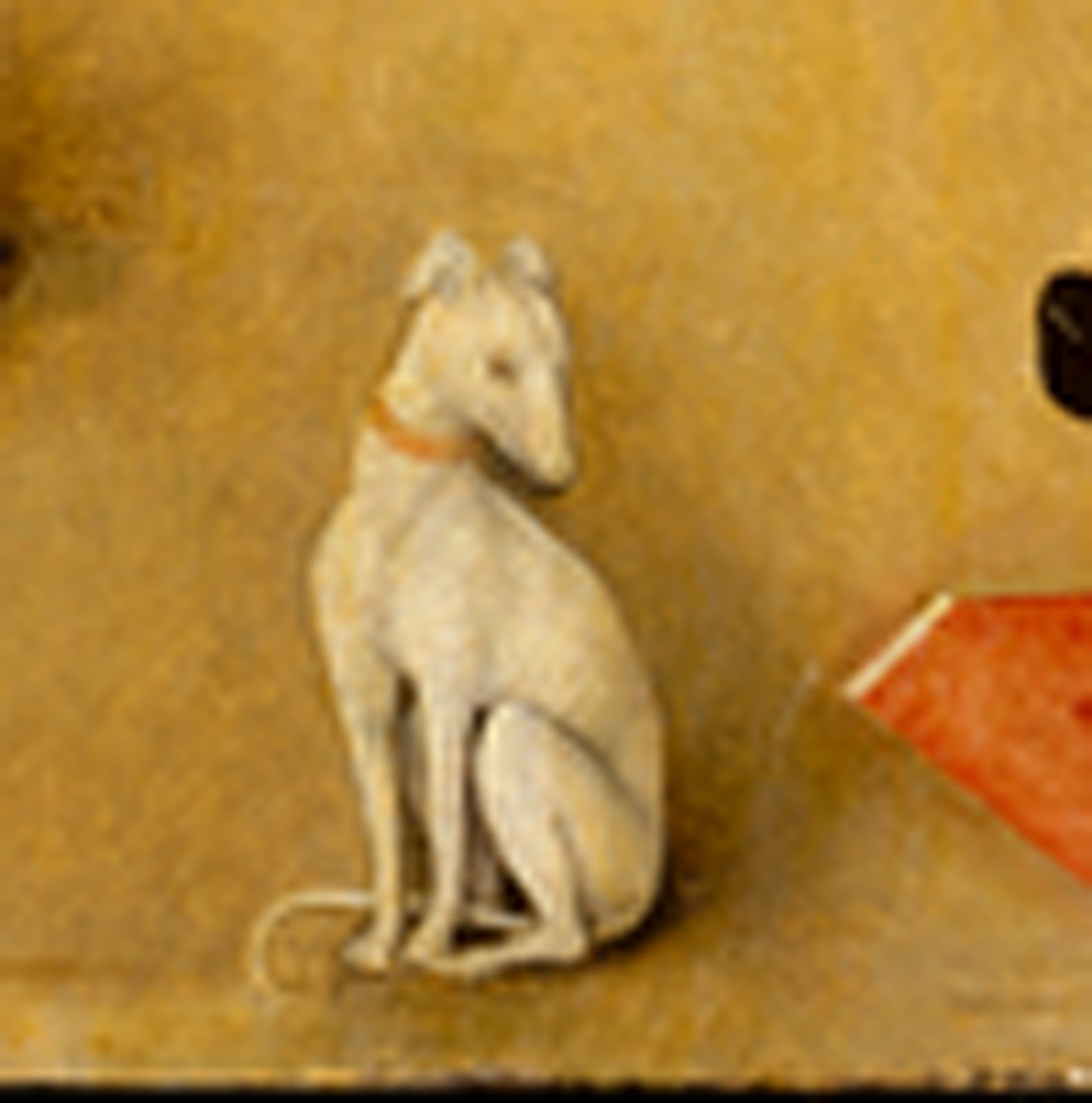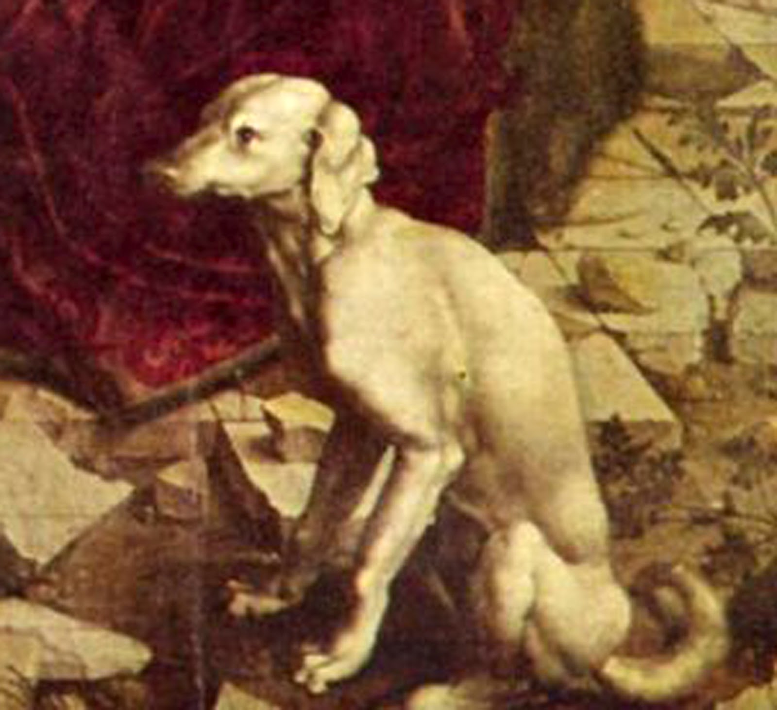 Detalle donde se representa un perro tipo whippet o lebrel italiano con pelo. Si os fijais este es el mismo perro que dibujó Durero en su St Eustaquio |