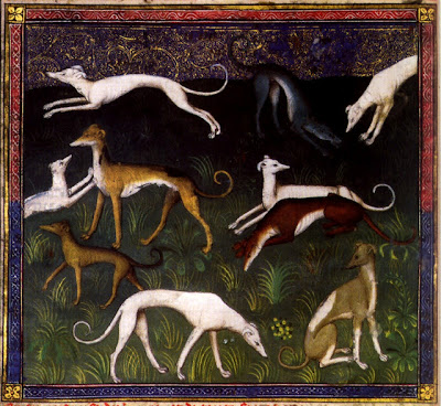| Lebreles, del libro de la caza de Gastón Phoebus. Miniatura, escuela francesa, siglo XIV |