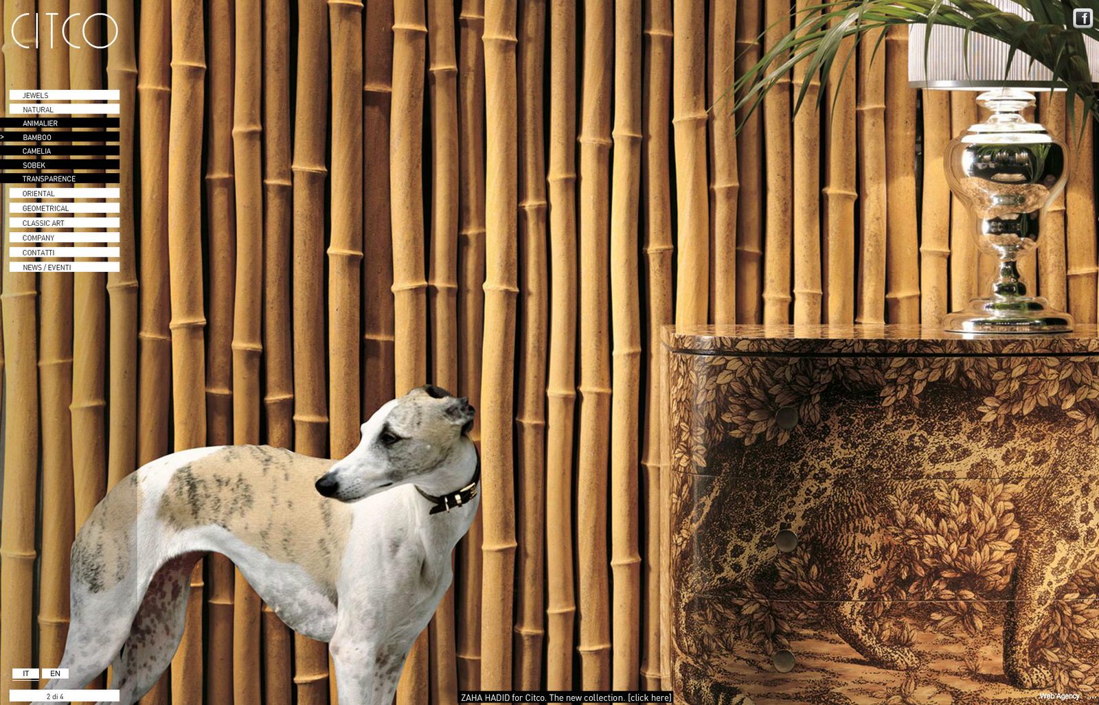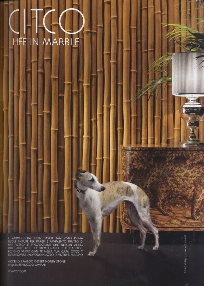 Citco es una empresa italiana que produce paneles espectaculares, tanto para interiores como exteriores, exclusivos y adaptados a cualquier dimensión y forma. Es una nueva forma de trabajar y ver la piedra o el marmol natural. La campaña publicitaria de este año y en sus catálogos han utilizado lebreles.