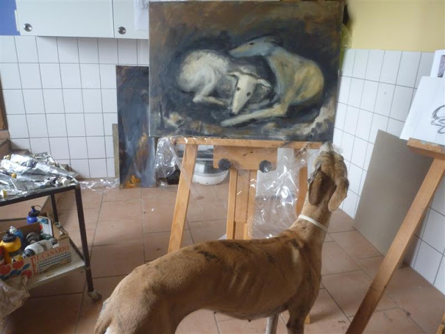 Claudia pinta y dibuja desde que era muy joven, y con casi todos los medios de comunicación: acuarela, pastel, óleo y pinturas acrílicas. Sus temas favoritos son los galgos desde que hace 25 años consiguió su primer perro.