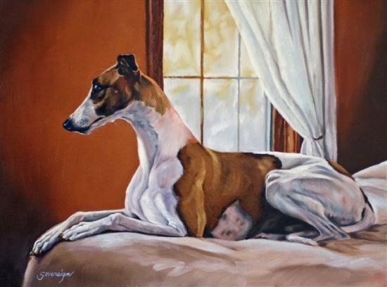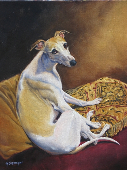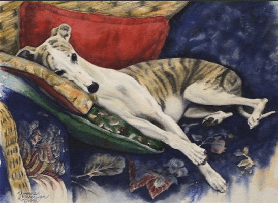 En este pequeño recorte de sus obras solo muestro los relacionados con whippets o galgos pero trabaja con más razas y podeis ver toda su obra en la págiana web oficial: yvonnesovereign.com