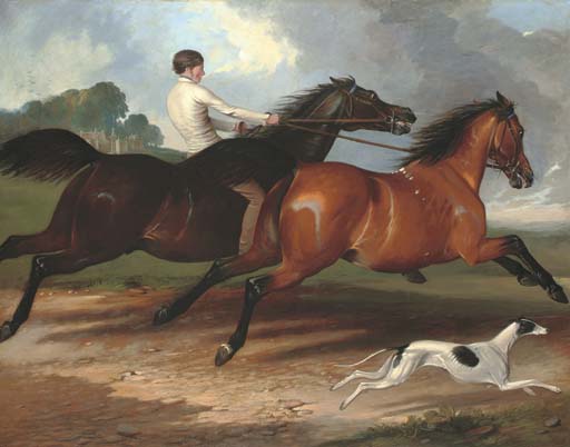 | A young man exercising horses and a greyhound in a landscape, a country house beyond |