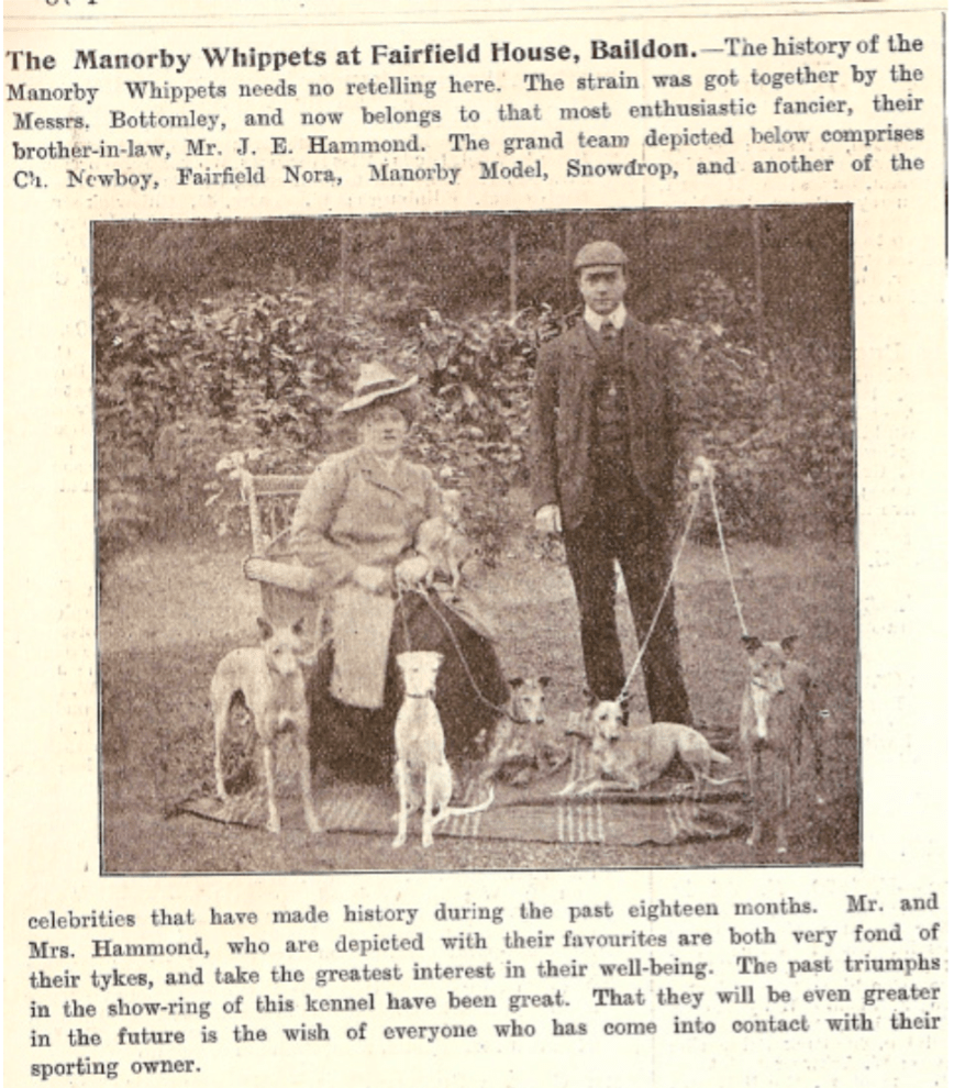 Los Whippets ingleses que llevan la raza hacia adelante incluyen al nieto de Zuber, Ch. Shirley Wanderer (1902) y el hijo más famoso de Wanderer Ch. Manorley Maorí. Un poco más tarde llegó Ch. Willesbeaux (quien fue exportado a los Estados Unidos), su gran rival Ch. Watford Brilliant y dos perros de una perrera que, por lo demás, no tenía nada de especial y que tuvo una gran influencia en los Whippets estadounidenses. Ch. Towy- side Tatters fue seleccionado como el foco de un programa de mejoramiento en el criadero Tiptree, que afectó profundamente en el desarrollo de Whippet en Inglaterra y América después de la Segunda Guerra Mundial, y Ch. Towyside Teasle fue exportado a América, donde produjo la hembra inicial para la gran perrera Meander.