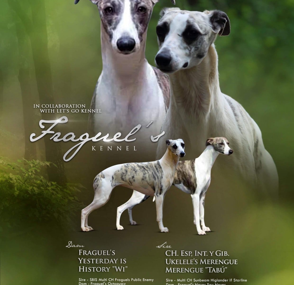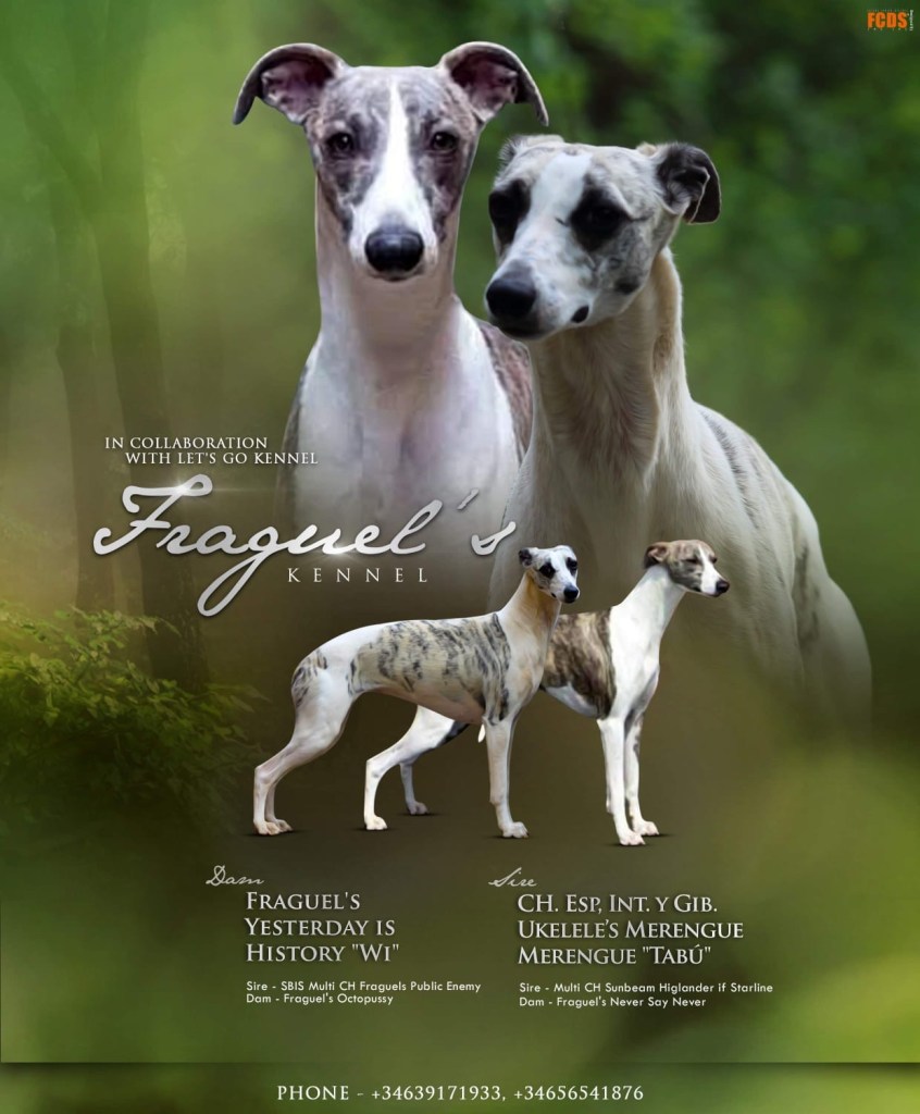 El pasado 10 de Junio Tabú “CH. Ukelele’s Merengue Merengue cubrió a la hembra Wi “Fraguel’s Yesterday is History. Hoy se confirma que si está preñada y para la semana del 12 de Agosto nacerán los pequeños. La camada tendrá el afijo Fraguel’s propiedad de Benjamin Sánchez García juez internacional y criador de múltiples campeones.
