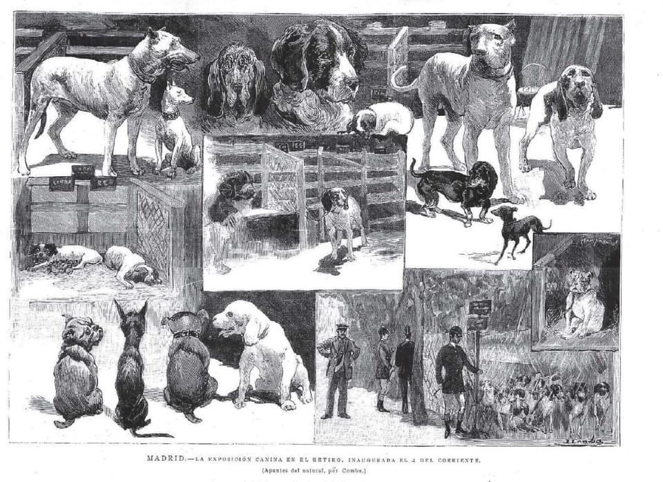La “La Ilustración Española y Americana”, del 15 de junio de 1890: “La Exposición canina, instalada en el Parque de Madrid a semejanza de las que hace muchos años se verifican en Inglaterra, Alemania y Bélgica, se inauguró en la tarde del 4, con asistencia de S.M. la Reina Regente y S.A. R. la infanta D. ª Isabel, y ante un público numeroso y distinguido”. Esta revista reproduce además a página completa un dibujo al natural de los perros más destacados, explicando a sus lectores sus características: “Nuestro grabado (dibujo del natural, por Comba) representa detallada y gráficamente los principales ejemplares de perros allí expuestos: en el centro del dibujo se reproduce el perro pachón “The”, galardonado con el premio de S M. la Reina Regente; al lado se ve a los pointers, pareja, “Re” y “Linda”, con sus numerosos cachorritos, propiedad de D. Antonio Ulbach, premiados por la Comisión organizadora; más abajo figura la jauría de Foxhounds, de la Sociedad de Caza de Madrid, que ha ganado el premio del Ayuntamiento; rodeando a esos tres dibujos están representados otros perros notables de la Exposición canina, entre ellos “Pipá” y “Pipí”, pachones, de D. Gabíno Stuyck; “Rondas” (basset), del Sr. Duque de Alba; “Pim” (Fox terrier), del Sr. Riano; “Lea”, “César” y “Sol” y tipos diferentes de bloodhound, mastines, bulldog y galguitos, un perro chino, otro de presa y algunos setters”