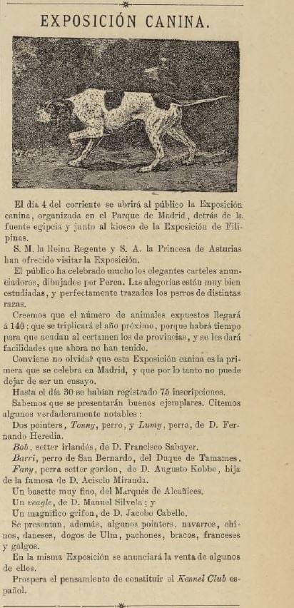 “La Ilustración Ibérica”, que se editaba en Barcelona, el día 11 de junio de 1890: “La exposición se divide en tres clases; perros de caza, perros de defensa y perros de lujo, y en las tres secciones se presentan ejemplares interesantísimos que denotan un mejoramiento notable en las razas”