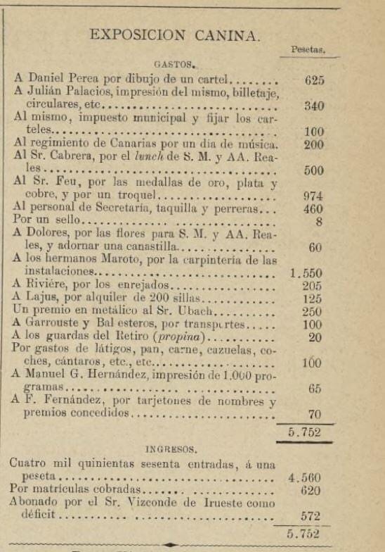 En el mes de mayo de 1890 se celebró en España la primera exposición canina de nuestra historia, que duró cinco días. Cerca del estanque del parque del Retiro se montaron las casetas. Los perros estaban expuestos en bancadas de madera individuales. Una banda interpretaba piezas de música popular para amenizar a los visitantes. Llamó mucho la atención un mastín enorme, colocado ligeramente apartado por su fuerte temperamento. De nombre “León” y de color dorado, pertenecía a Antonio Cánovas del Castillo, presidente del Consejo de Ministros. Participaron 150 perros. Se hicieron públicos los gastos e ingresos generados por el acto. Los gastos totales de organización alcanzaron la suma de 5.752 pesetas y los ingresos fueron 4.560 pesetas en entradas, al precio de 1 peseta por unidad. y 620 pesetas por inscripciones de los perros, quedando un déficit de 572 pesetas.