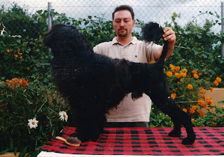 Mientras tanto me habían ofrecido importar una pareja de perros de agua portugués del afijo «Do Vale Negro» (Carla Molinari) , era una raza desconocida para mi, pero estéticamente me gustaba y lo que había leído del carácter me hizo decir que si, entraron en casa «Malia do Vale Negro» y «CH. U’diabo Do Vale Negro. Nunca se adaptaron a su nueva vida, tenían un carácter demasiado dependiente del dueño y creo que vinieron demasiado mayores, lo que hacía que fueran tímidos y difíciles de presentar, supongo que fue demasiado drástico el cambio. Aun así U’diabo consiguió el campeonato de España e hice dos camadas con muy poca fortuna. Vivieron en casa hasta los 9 años ella y hasta los 7 el.